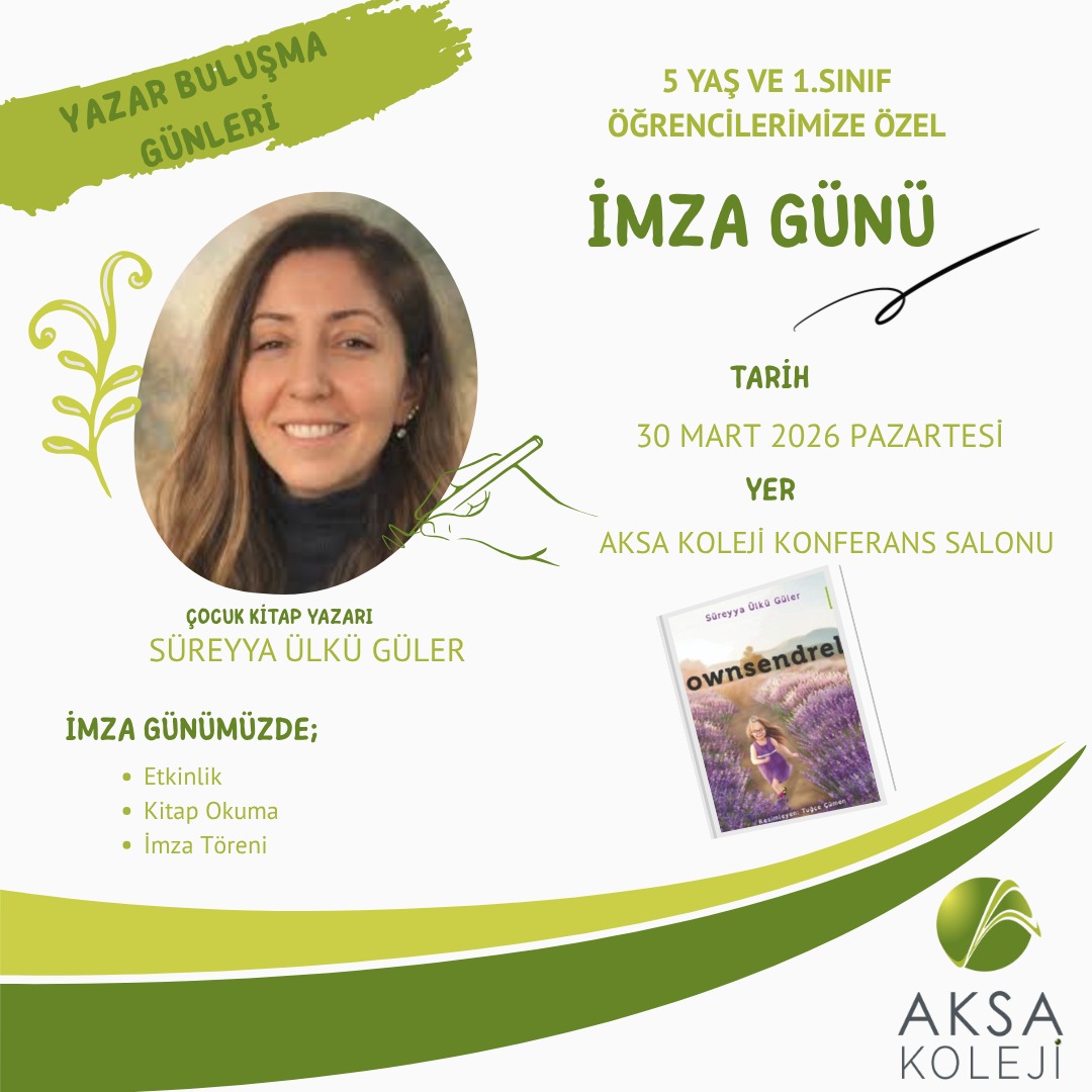 5 yaş ve 1. sınıf öğrencilerimize özel düzenlediğimiz İmza Günü etkinliğimizde, değerli çocuk kitapları yazarı Süreyya Ülkü Güler ile buluşuyoruz! 💚