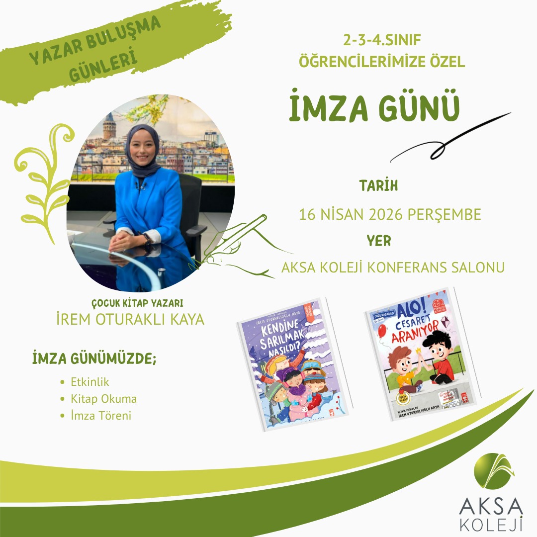 2, 3 ve 4. sınıf öğrencilerimize özel düzenlediğimiz İmza Günü etkinliğimizde, çocuk kitapları yazarı İrem Oturaklı Kaya ile bir araya geliyoruz! 🗓 Tarih: 16 Nisan 2026, Perşembe📍 Yer: Aksa Koleji Konferans Salonu 🎉