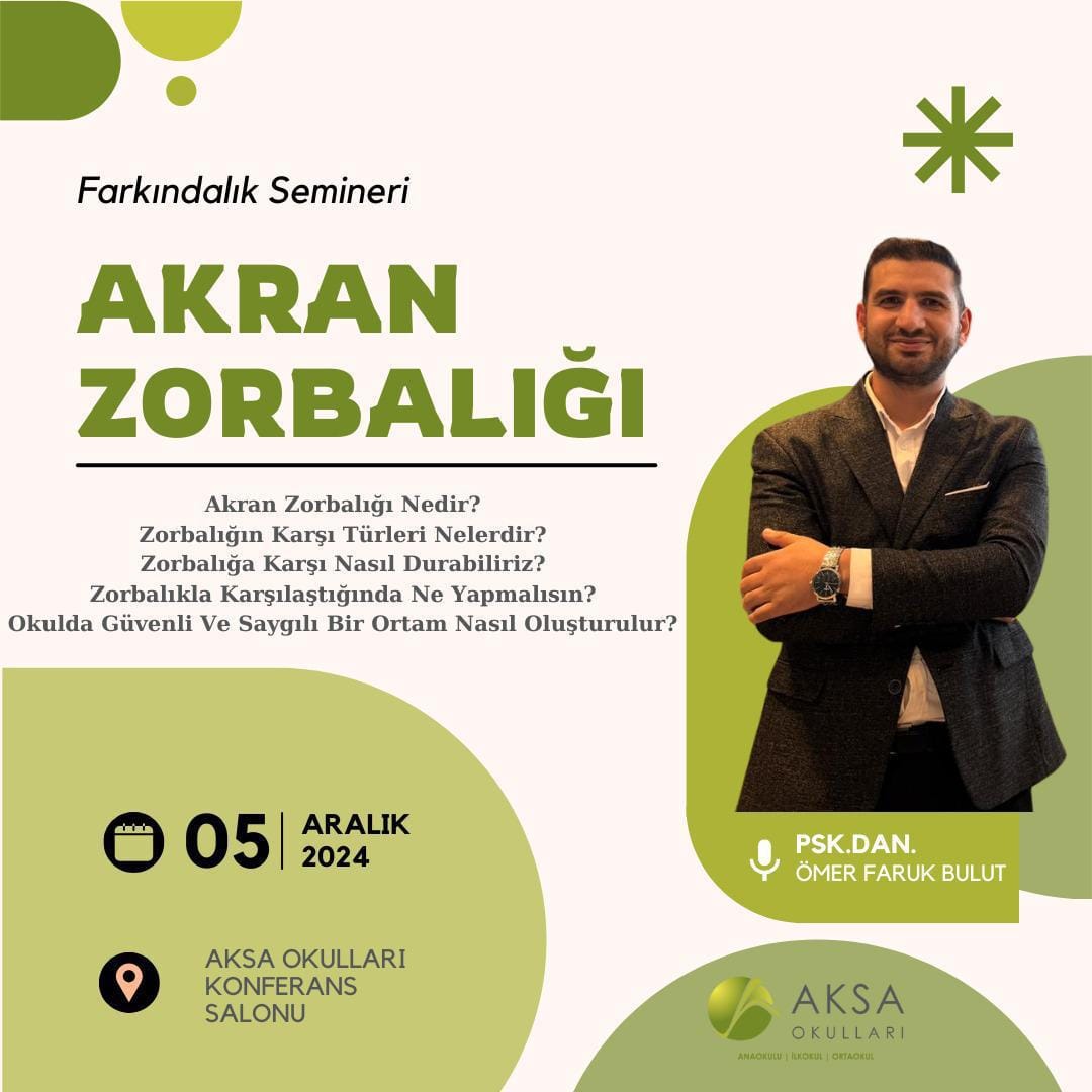 Değerli Veliler5 Aralık Perşembe okulumuzda Akran Zorbalığı semineri düzenlenecektir. Bu seminer, öğrencilerimizin sosyal ilişkilerinde empati ve sağlıklı iletişim becerileri kazanmalarını sağlamak amacıyla gerçekleştirilmiştir. Seminerde, zorbalığın tanımı, türleri ve başa çıkma yöntemleri hakkında bilgi