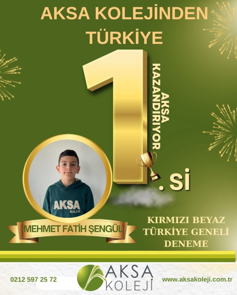 Kırmızı Beyaz Türkiye Geneli Deneme Sınavı’ndaöğrencimiz Mehmet Fatih ŞengülTürkiye 1.si olarak bizleri gururlandırdı. Azim, disiplin ve doğru rehberliklebaşarı tesadüf değildir. Öğrencimizi ve emeği geçen tüm öğretmenlerimizi tebrik ediyor,başarılarının devamını diliyoruz. AKSA KOLEJİBaşarıyı Aksa Kazandırır.
